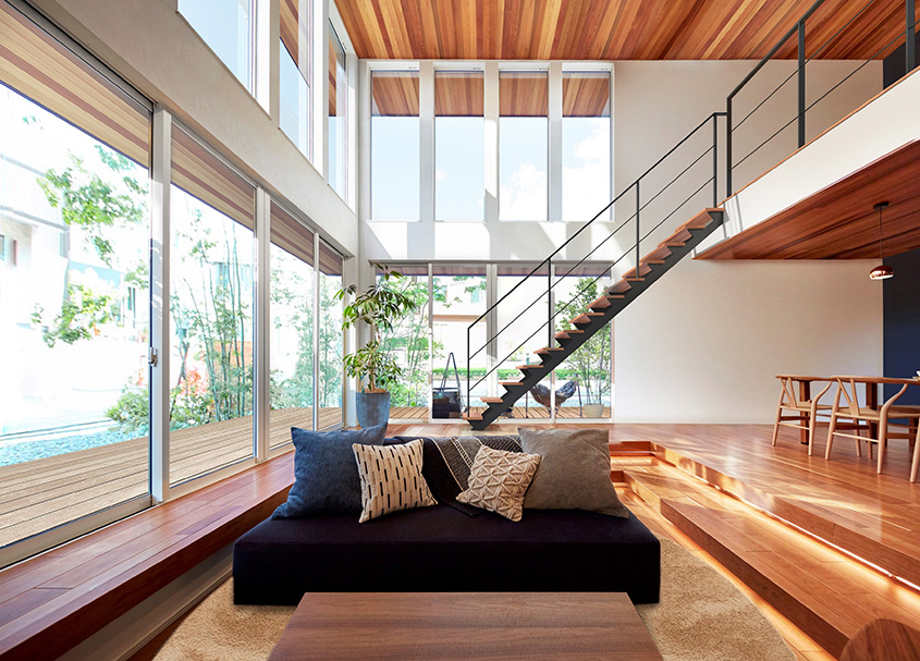 耐震性・耐久性の高い家づくりを追求していく中で、建物外周部を強固にすることで内部の柱を大幅に減らし、間取り自由度を高めることが可能に! 通常の耐力壁の何倍もの強度を持つ、独自開発の耐力壁を組み合わせることで、柱や壁のない大空間、開放的な大開口を生み出しています。特に業界最強との呼び声も高い耐力壁「8トン壁」を使用した場合、その強度の分だけ壁を少なくできるため、高い耐震性を保ちつつ、約30帖の広々とした無柱空間に、6mを超える大開口が実現!その驚くほどの開放感はおのみち展示場モデルハウスでも体感できます。