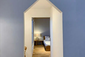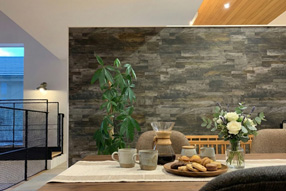 全体的にモダンなカフェのような雰囲気のモデルハウスの中で、唯一の「和」を感じさせるスタイリッシュな和室スペースです。雰囲気をぐんと落ち着かせるチャコールグレーの琉球畳を使用し、壁面と畳面で色の濃淡を楽しめる設えになっています。また、壁には縦ラインの間接照明が流れるような光を放ち、和室ならではの凛とした気品を表現しています。