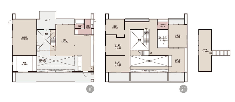 玄関から広がる土間スペースの上は全て吹抜。梁と木板天井が木のぬくもりを感じられる空間を作り、明るい床板に黒いアイアンをアクセントで入れることによって落ち着いた雰囲気に。開放感と家族の繋がりをご提案いたします。