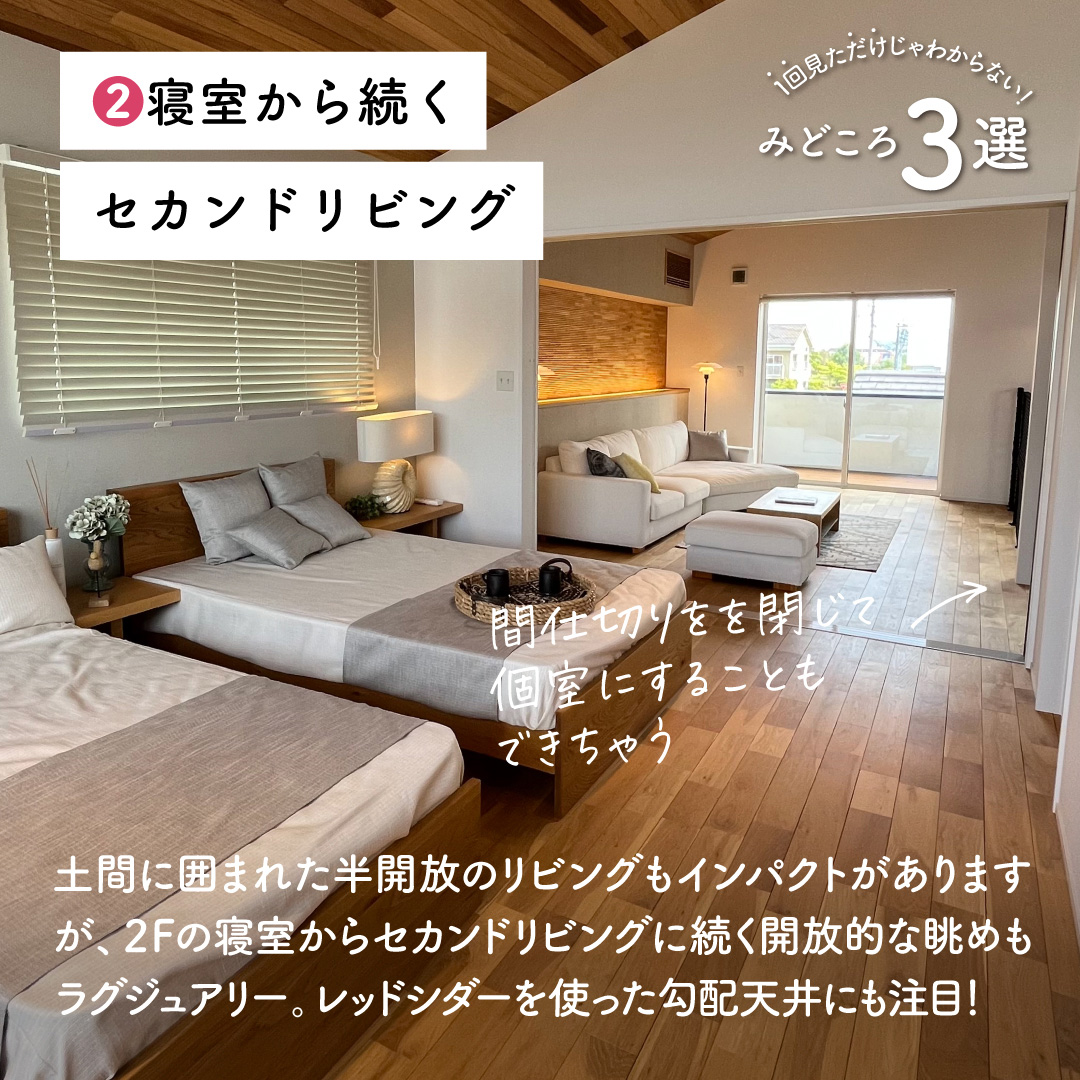 L字形に土間で囲まれた、間仕切りを減らして空間を半開放にしたユニークなリビング。内部と外部を穏やかに繋ぐ場所で休日のひととき、仕事後の寛ぎを楽しんでいただけます。